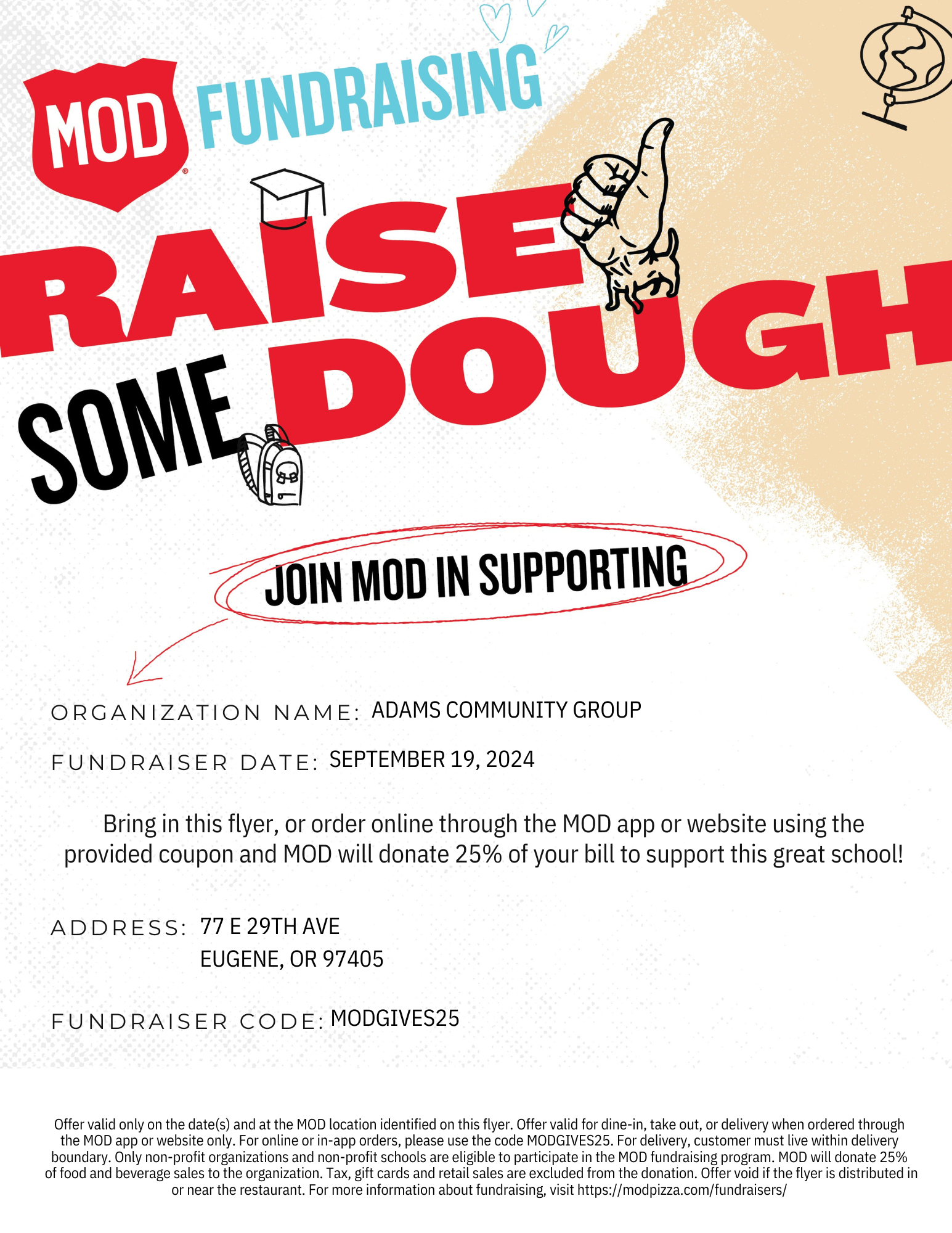 Bring this flyer or order online at modpizza.com or with the MOD app and use the code: MODGIVES25